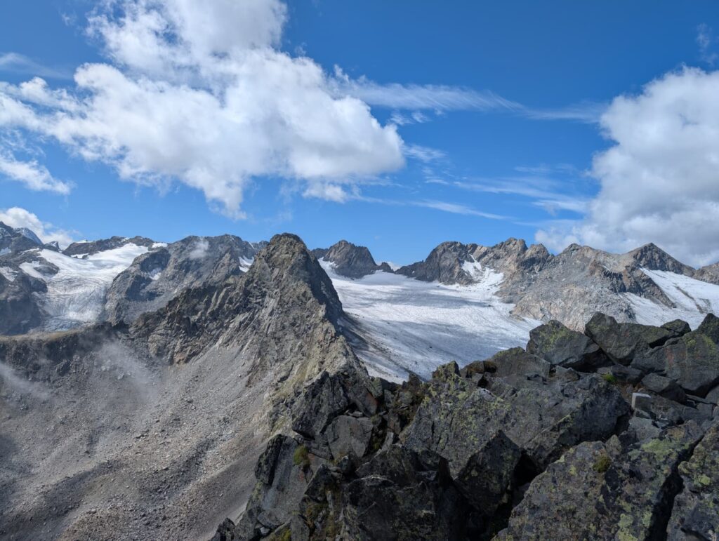 Am Gipfel der Rinnenspitze genießt man ein ausgesprochen tolles Panorama auf die Stubaier Alpen. Mit einem tollen Rundumblick kann man vor allem die verhältnismäßig großen Gletscher wie den Lüsener Ferner oder den Alpeiner Ferner, auf den eine Route auf die Ruderhofspitze führt. So gelangt man letztlich verhältnismäßig einfach auf einen tollen 3.000er mit einer recht guten Infrastruktur, die vielleicht (man darf ja noch träumen) früher oder später sogar noch besser wird, wenn der Start ab Oberiss wieder gestattet wird.