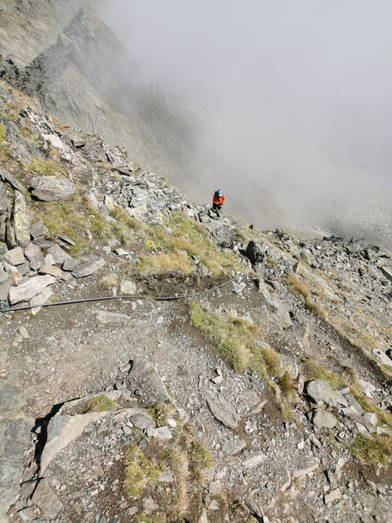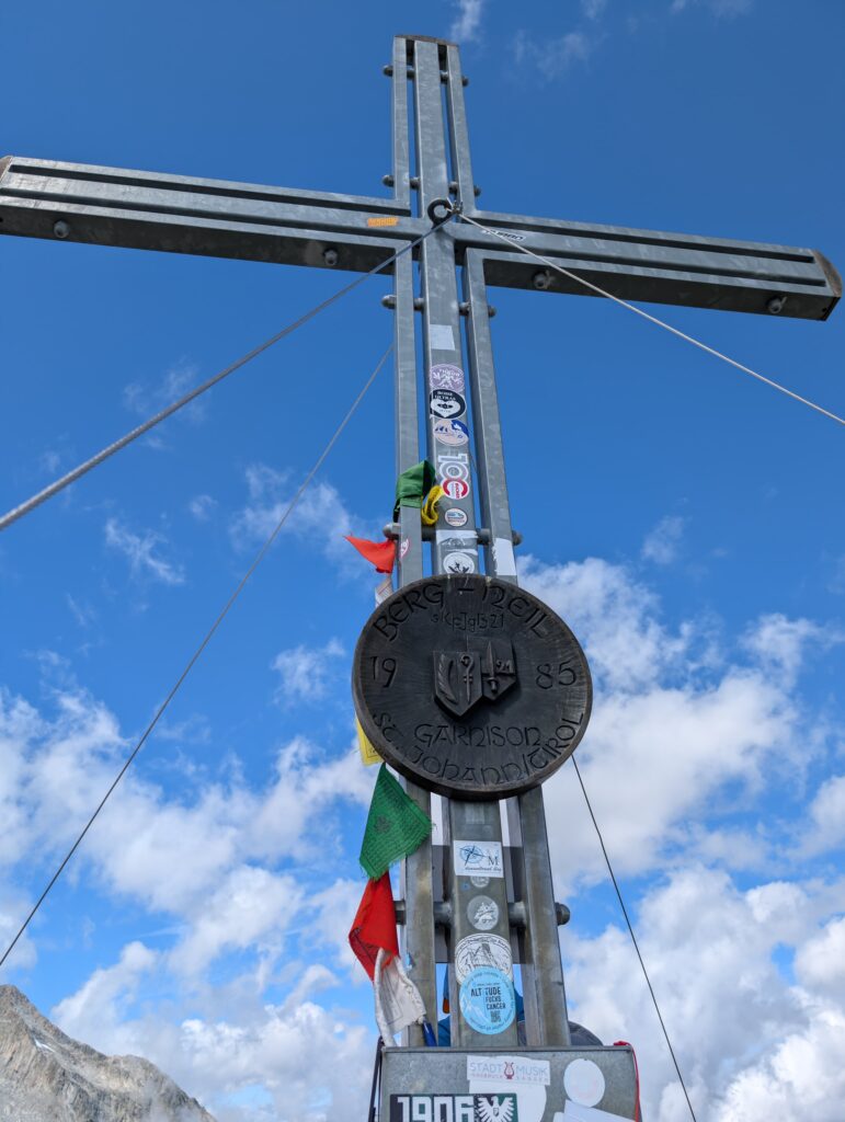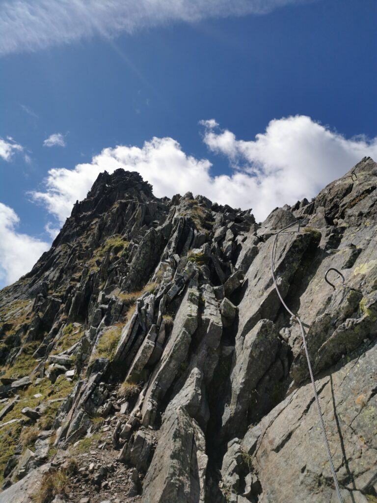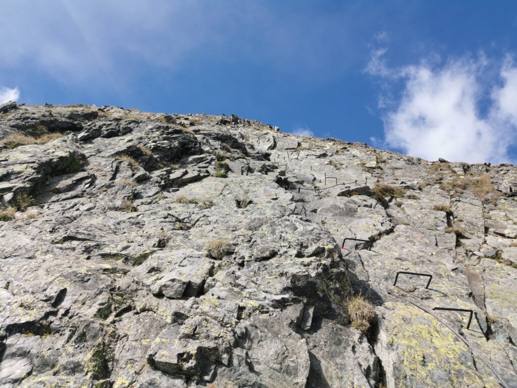 Der Gipfelhang stellt dann nochmal ein paar Ansprüche. Man darf gelegentlich die Hände zur Hilfe nehmen, wenn Trittstufen im glatten Fels und ein Stahlseil zur Hilfe bereitstehen. Auch als Purist sollte man sich nicht dazu verleiten lassen die künstliche Unterstützung kraxelnd zu umgehen. Auch wenn das Kristallin durchaus fest wirken mag, ist es abseits des angelegten Weges überaus brüchig und nicht zu empfehlen. Vor allem im Sinne des potenziellen Steinschlags, der dabei auf Wanderer in Richtung Rinnensee hinabstürzen würde. Am x-fach begangenen Weg ist aber tatsächlich kein einziger lockerer Stein zu finden. An einer Stelle gilt es nochmal mit etwas Kraft sich nach oben zu wuchten (Achtung, dass die Wuchtgewichte um die Hüfte richtig verteilt sind), dann hat man es auch schon geschafft.
